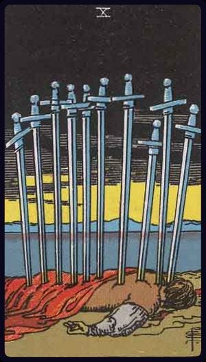 “From the blue skies of the court cards to the black gloom of the Ten and Nine. Just as the Ten of Cups showed joy overflowing, so the Ten of Swords fills us with pain. Despite the extreme picture the card does not represent death, or even especially violence. It signifies more of a reaction to problems than the problems themselves.” Seventy-Eight Degrees of Wisdom: A Tarot Journey to Self-Awareness by Rachel Pollack, p. 216